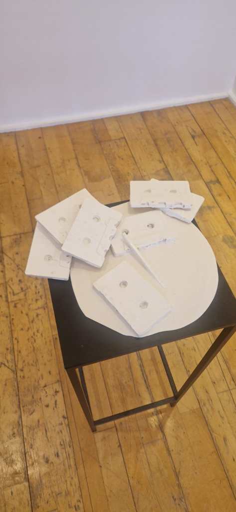 In *Rewind*, the artist crafts a deceptively simple yet profoundly evocative meditation on memory, creativity, and obsolescence. At its core lies white, cast cassette tapes—weathered stripped of their function and cast aside—paired with a slender white pencil, poised as if ready to interact with the objects. This pairing recalls a tactile ritual familiar to a bygone era: the manual rewinding of tape with the barrel of a pencil, a small act of resourcefulness now rendered obsolete by advancing technology.