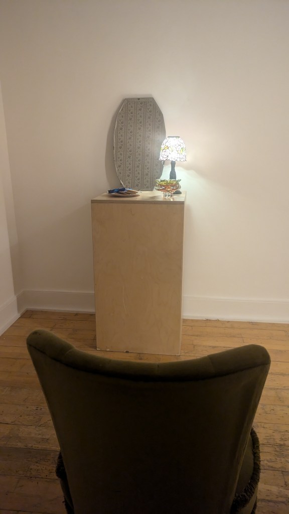 In a dimly lit room steeped in quiet nostalgia, an evocative art installation invites viewers to step into an intimate tableau. The space is sparse yet deliberate: a mid-century soft velvet vintage chair sits confidently in the centre, facing a small table upon which an ashtray lamp and a mirror rests. The tarnished mirror reflects a glimpse of dated patterned wallpaper—a subtle yet evocative detail that deepens the sense of place. The air is saturated with a trio of scents—homemade lentil soup, Comfort fabric conditioner, and the faint, acrid residue of extinguished cigarettes—conjuring an uncanny blend of domesticity and melancholia.